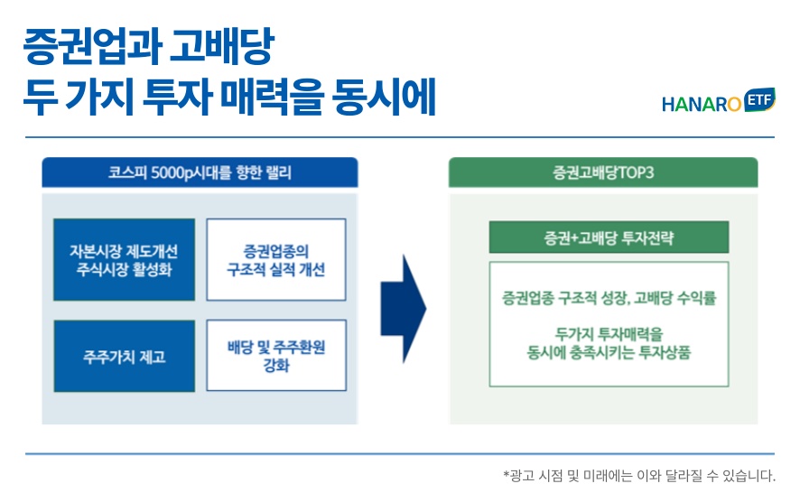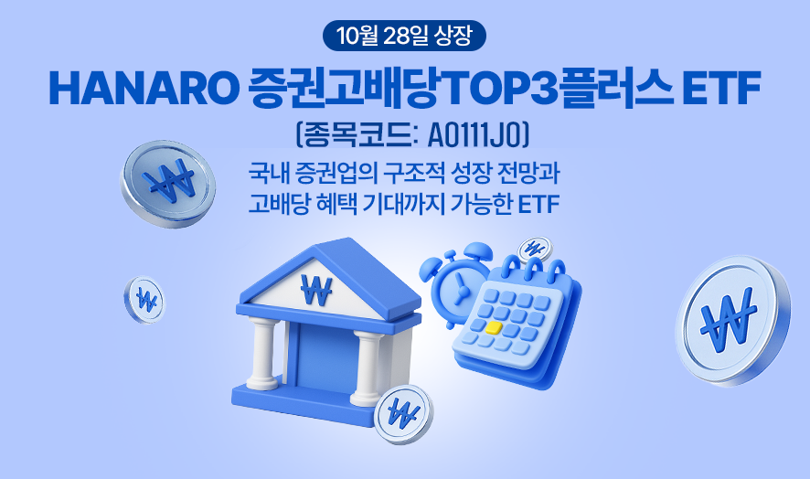 현재 대한민국 주식시장의 ‘코리아 디스카운트’가 해소되며 코스피 5,000 시대를 열어젖힐 것이라는 기대감이 높아지고 있습니다. 정부의 자본시장 선진화를 위한 제도 개선 기대감에 힘입어 국내 주식 시장은 높은 성장세를 보이고 있는데요. 이와 더불어 상법 개정 및 자사주 소각 의무화 등의 정책 지원에 힘입어 배당 매력 역시 높아지는 상황입니다. 이 같은 변화는 증권업의 구조적 성장을 촉발할 가능성이 높은데요. 현 상황을 고려해 증권업 투자와 고배당 수익 추구 두 가지 전략을 실천하고 싶은 투자자라면 10월 28일 신규 상장한 HANARO 증권고배당TOP3플러스 ETF에 대해 자세히 알아보시기 바랍니다.
