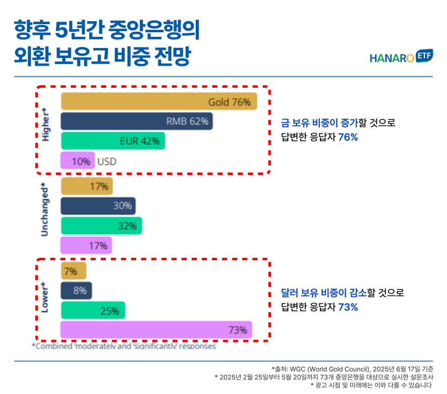 세계금협회(WGC)가 25년 6월 16일 발표한 ‘2025년 중앙은행 금 보유량 설문조사’*에 따르면 각국의 중앙은행은 ‘향후 5년간 외환보유고에서 달러 비중은 축소, 금 비중은 확대할 계획’이라고 답했습니다. 해당 설문조사에서는 응답자 중 76%가 ‘향후 5년 내 총 외환보유액 중 금의 비중이 상당량 증가할 것’이라고 답했는데요. 이는 전년도 응답률 69%에서 더욱 상승한 수치입니다.