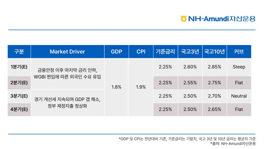 더불어, 올해 통화 정책 완화에 따른 경기 개선 효과가 확인되면서 기준금리 인하 사이클은 종료될 것으로 보입니다. 또한 오는 4월 세계국채지수(WGBI) 편입에 따른 외국인 매수세 유입이 예상됨에 따라 시장 금리가 하향 안정화될 전망입니다.