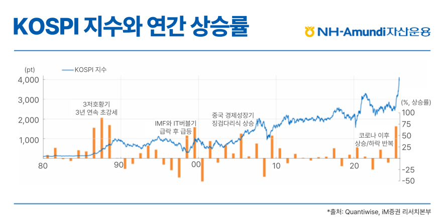 2025년은 코스피가 연간 약 72%의 상승률을 기록하며 사상 최초로 4,000 포인트 시대를 연 역사적인 한 해였습니다. 이는 1980년대 3저 호황 이후 최대 상승폭인데요. 지난해 국내증시가 새로운 역사를 써내려가기까지의 주요 포인트를 살펴보겠습니다.