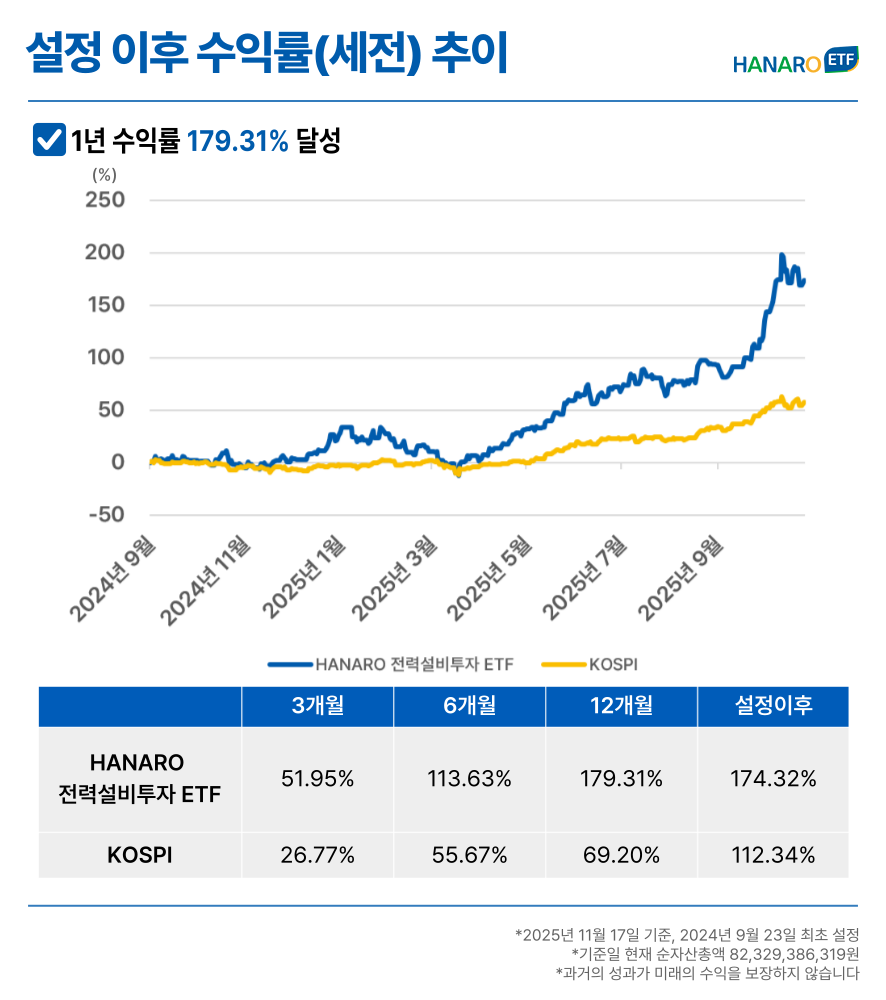 전 세계적으로 전력 수요가 폭증하며 국내 전력기기 업체에 대한 긍정적 전망이 제시되는 가운데, 3분기 실적 또한 이를 뒷받침하고 있습니다. 효성중공업과 HD현대일렉트릭, LS일렉트릭 3사를 비롯한 국내 주요 전력기기 업체 합산 3분기 수주 잔고가 30조 원을 돌파하며 호실적을 기록했죠. 또한, AI붐과 데이터센터 확산 등 글로벌 메가 트렌드가 성장을 뒷받침하는 만큼, 국내 전력설비 산업 성장 모멘텀은 수년간 지속될 것으로 기대됩니다. 이처럼 긍정적 전망이 기대되는 국내 전력설비 산업 투자를 고려 중인 개인 투자자라면 AI 전력 인프라 핵심 기업에 투자하는 HANARO 전력설비투자 ETF에 대해 자세히 알아보시기 바랍니다.